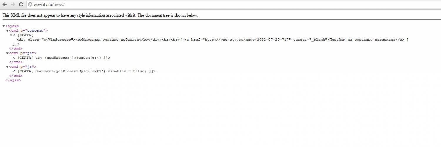 Вместо знакомого всем скрипта "Ваш материал добавлен", который появляется после добавления материала в любой из разделов сайта, у меня появляется это: