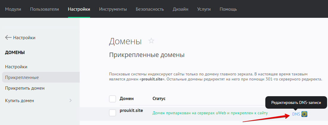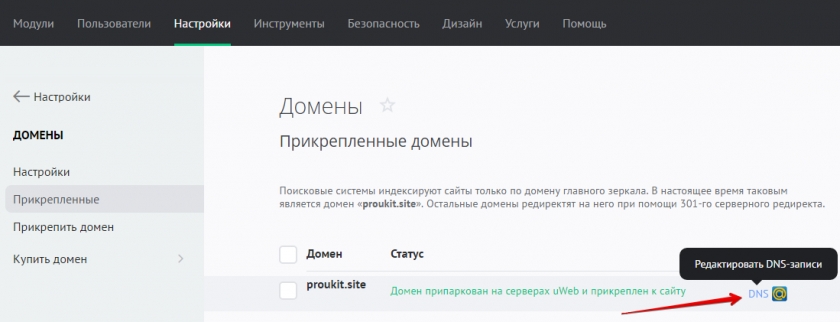Перейдите в панель управления, в верхнем меню выберите Настройки - Домены - Прикрепленные. У основного домена (если их несколько) перейдите к редактированию DNS-записей: