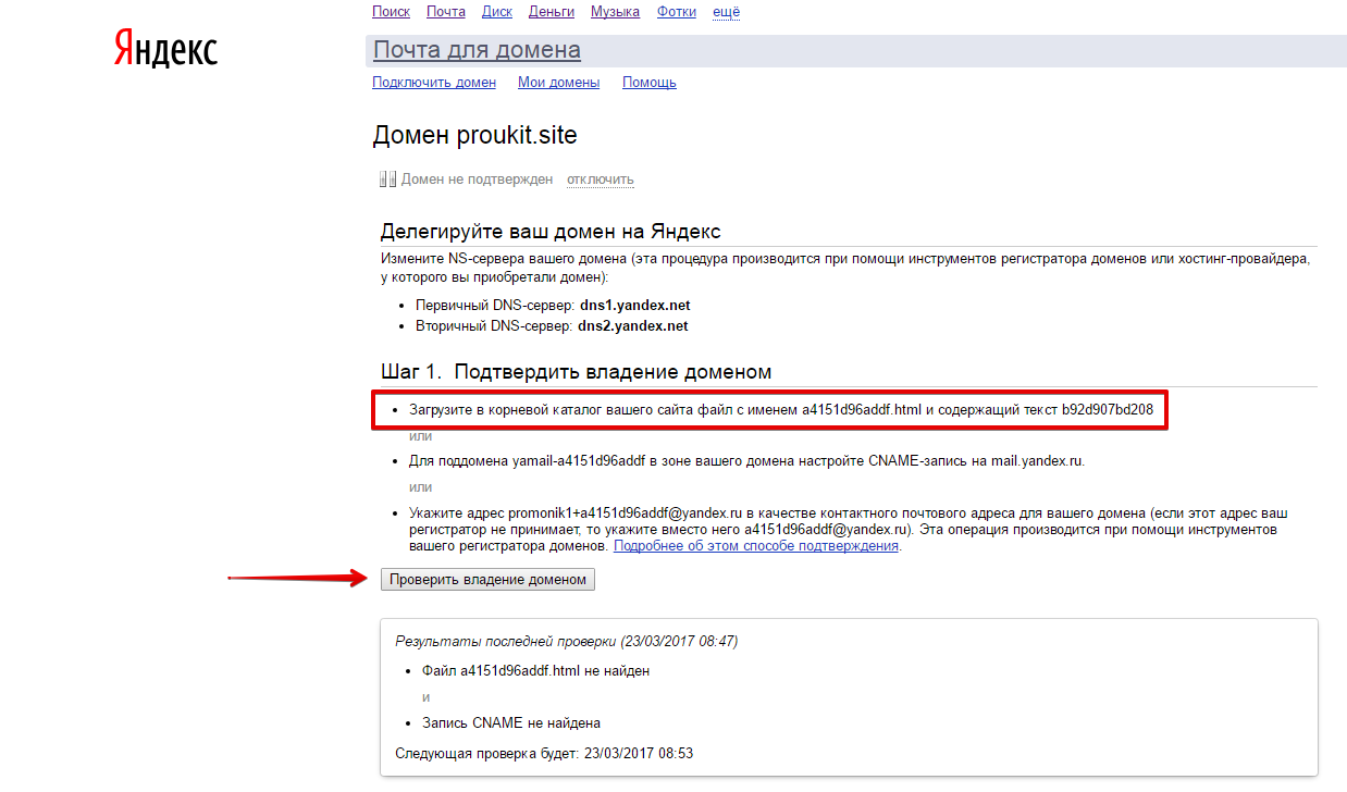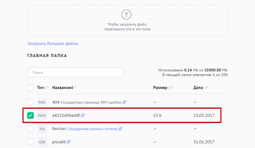 Далее нам предлагают подтвердить право владения доменом. Самый быстрый способ — это загрузка HTML-файла в корневой каталог. Создайте файл с указанным именем и содержимым, затем через файловый менеджер (так быстрее) или FTP-клиент загрузите его в корневой каталог.