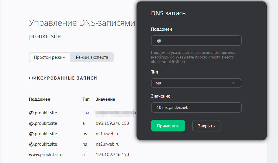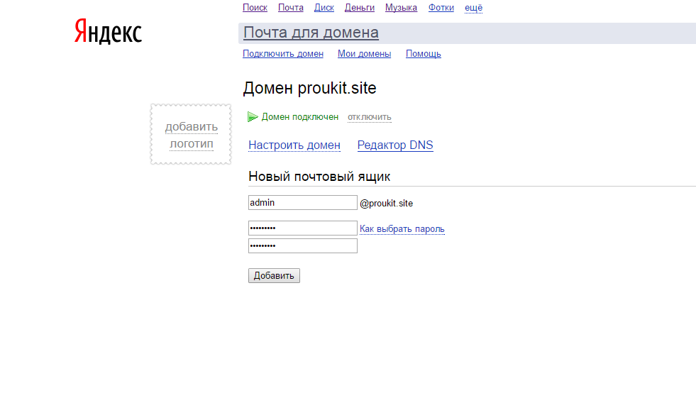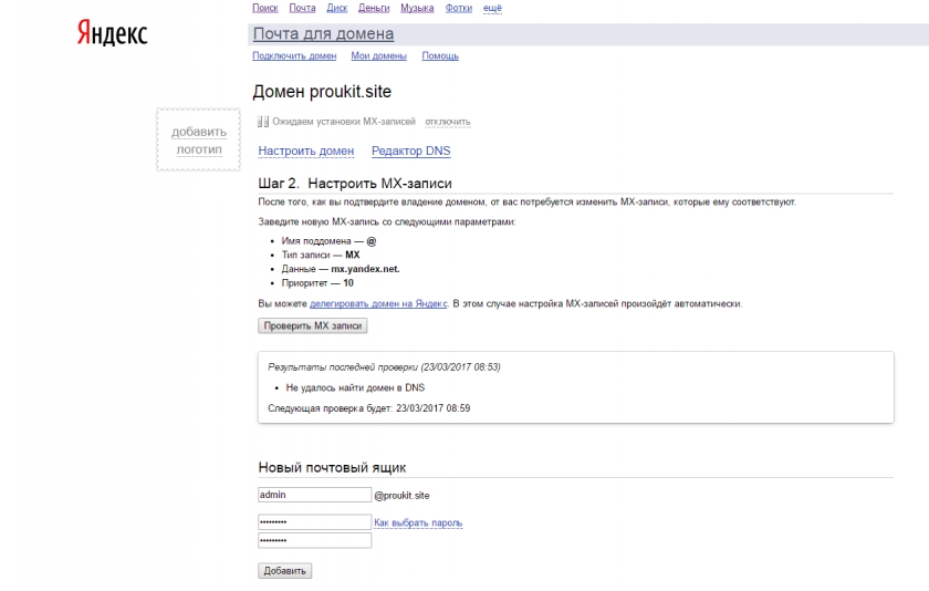 Через несколько часов MX-записи вступят в силу и в личном кабинете Яндекса можно будет проверить их наличие. Для этого нажмите на кнопку «Проверить MX-записи». После успешной проверки вы перейдете к шагу создания почтового ящика, введите требуемое имя (я использовал admin@proukit.site, так как в дальнейшем эту почту буду использовать для покупки SSL-сертификата), пароль и создайте ящик, нажав на кнопку «Добавить».