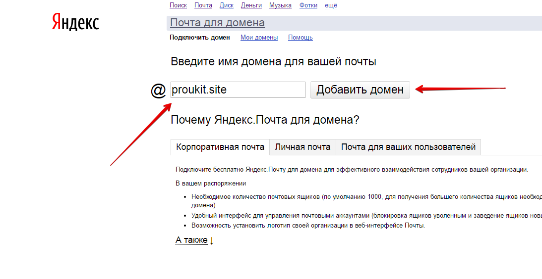 На открывшейся странице вводим в поле имя вашего домена и жмем на кнопку «Добавить домен»: