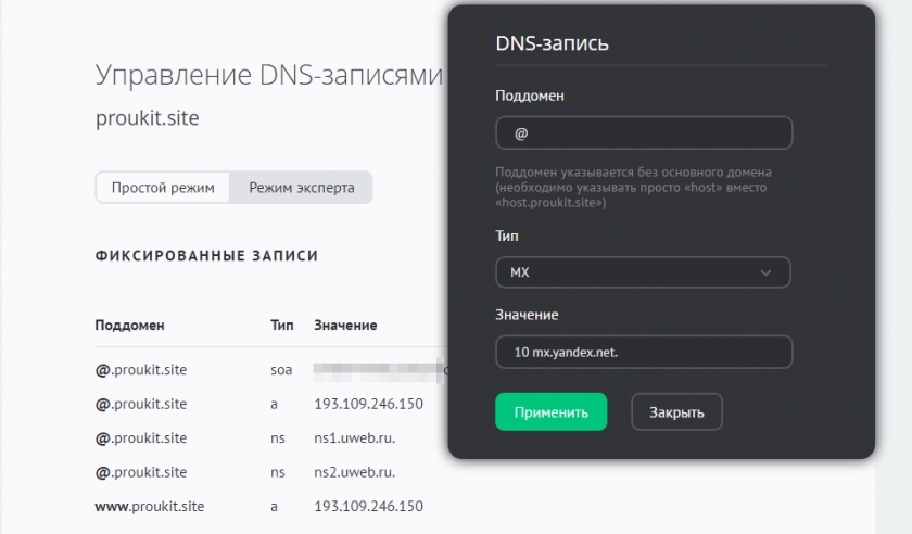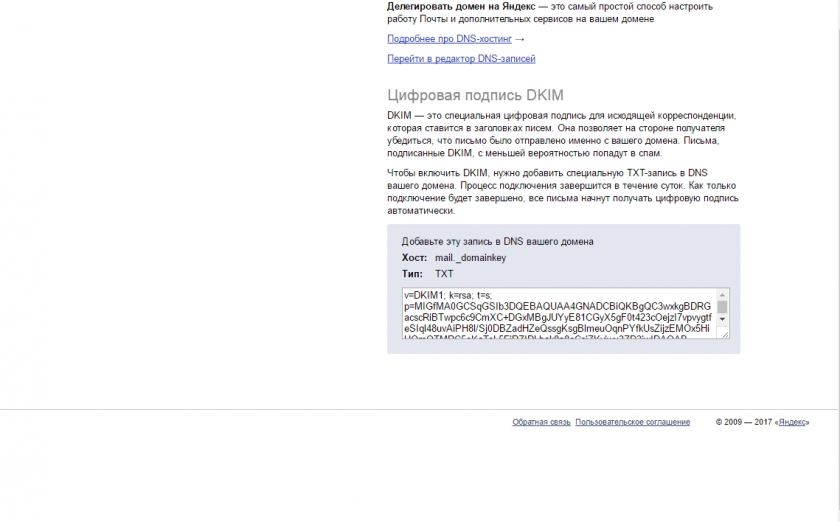 Для возможности рассылки необходимо установить цифровую подпись DKIM. В панели управления вновь перейдите к редактированию DNS-записей в режиме эксперта и создайте запись типа TXT, значения для которой необходимо получить в правом нижнем углу страницы только что созданного ящика в панели управления Яндекса: